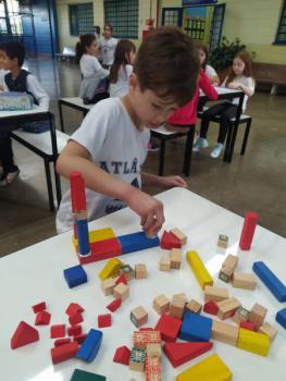 Os alunos dos 3ºs anos criaram esculturas em blocos de madeira no formato de sólidos geométricos com a finalidade de identificar, reconhecer e aplicar os conhecimentos em esculturas criativas.